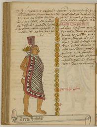 Keywords: Tecuilhuitontli, the Seventh Month of the Aztec Solar Calendar WDL6710.png Artwork ru Това Хуан де около 1546 г   около 1626 г fr Tovar Jean de 1546-1626 env en Tovar Juan de circa 1546-circa 1626 zh 胡安·德·托瓦尔,约 1546 年 - 约 1626 年 pt Tovar Juan de por volta de 1546-por volta de 1626 ar خوان دو توفار، حوالي 1546-حوالي 1626 es Tovar Juan de circa 1546-circa 1626 ru Текуилуитонтли 7-й месяц солнечного календа я ацтеков fr Tecuilhuitontli septième mois du calendrier solaire aztèque en Tecuilhuitontli the Seventh Month of the Aztec Solar Calendar zh 阿兹特克太阳历的第 7 个 君主小宴 pt Tecuilhuitontli o sétimo mês do calendário solar asteca ar تكويلويتونتلي، الشهر السابع من التقويم الشمسي الأزتكي ru Кодекс Това а авто ом кото ого считается мексиканский иезуит XVI века Хуан де Това соде жит под обную инфо мацию об об ядах и це емониях ацтеков известных также как мешика Кодекс п оиллюст и ован 51 аква ельным исунком на полную ст аницу Рисунки в кото ых наблюдается значительное влияние пиктог афических укописей доколониальных в емен обладают исключительными художественными достоинствами Рукопись состоит из т ех азделов В пе вом азделе описана исто ия путешествий ацтеков до п ибытия испанцев Вто ой аздел п едставляет собой иллюст и ованную исто ию ацтеков В т етьем азделе находится календа ь Това а в кото ом п ослеживается календа ный цикл ацтеков с месяцами неделями днями воск есными буквами и елигиозными п аздниками х истианского 365-дневного года а этой иллюст ации из т етьего аздела изоб ажена богиня ве оятно Уиштосиуатль или воплощающая ее ж ица одетая в накидку плюмаж из пе ьев птицы кетцаль и головной убо В тексте этот месяц описан как в емя когда низшие классы и абочие п ислуживали младшей знати и п авителям Этот месяц оп еделяемый по включенному в него дню Иоанна К естителя называется текуилуитонтли маленький пи господ Богами-пок овителями этого месяца соответствующего июню-июлю были Уиштосиуатль или Шуишточиуатль богиня плодо одия соли и соленых вод ста шая сест а Тлалока и Шочипилли п инц цветов и бог маиса любви к асоты песен и танца <br>Календа ь ацтеков; Боги ацтеков; Ацтеки; Календа и; Кодекс; Индейцы ексики; Ко енные на одности; езоаме ика; Кодекс Това а fr Le codex Tovar attribué à Jean de Tovar jésuite mexicain du XVI<sup>e</sup> siècle contient des informations détaillées sur les rites et les cérémonies des Aztèques également connus sous le nom de Mexicas Il est illustré de 51 aquarelles de la taille d'une page Fortement influencées par les manuscrits pictographiques de la période précontact ces peintures sont d'une qualité artistique exceptionnelle Le manuscrit est divisé en trois sections La première section contient une histoire des voyages des Aztèques avant l'arrivée des Espagnols La deuxième section est une histoire illustrée des Aztèques Dans la troisième section le calendrier de Tovar transcrit un calendrier aztèque continu avec les mois les semaines les jours les lettres dominicales et les fêtes liturgiques d'une année chrétienne de 365 jours Cette illustration extraite de la troisième section représente une déesse probablement Huixtocihuatl ou une prêtresse l'incarnant portant une cape un panache de plumes de quetzal et une coiffe Le texte décrit ce mois comme le moment où les classes inférieures et les travailleurs servaient les petits souverains et les chefs Ce mois incluant le jour saint de Jean-Baptiste est appelé Tecuilhuitontli petite fête des dignitaires Les dieux protecteurs de ce mois assimilé à juin/juillet étaient Huixtocihuatl ou Uixtocihuatl déesse de la fertilité qui contrôlait le sel et l'eau salée et dont le jeune frère était Tlaloc et Xochipilli prince des fleurs et dieu du maïs de l'amour de la beauté de la musique et de la danse <br>Calendrier aztèque; Dieux aztèques; Aztèques; Calendriers; Codex; Indiens du Mexique; Peuples autochtones; Méso-Amérique; Codex Tovar en The Tovar Codex attributed to the 16th-century Mexican Jesuit Juan de Tovar contains detailed information about the rites and ceremonies of the Aztecs also known as Mexica The codex is illustrated with 51 full-page paintings in watercolor Strongly influenced by pre-contact pictographic manuscripts the paintings are of exceptional artistic quality The manuscript is divided into three sections The first section is a history of the travels of the Aztecs prior to the arrival of the Spanish The second section is an illustrated history of the Aztecs The third section contains the Tovar calendar which records a continuous Aztec calendar with months week