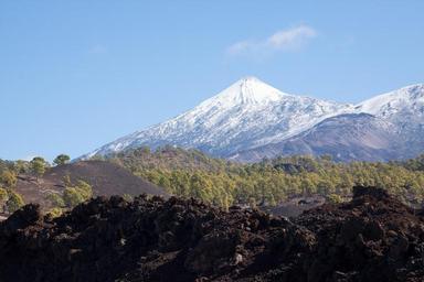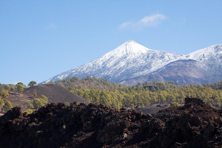 Keywords: teide volcano mountain summit pico del teide teyde national park tenerife canary islands 3718 m 3718 meter 3718 snow blue white green brown lava lava rock lava fields boulders lunar landscape pine canary kiefer pinus canariensis contrast death live