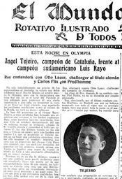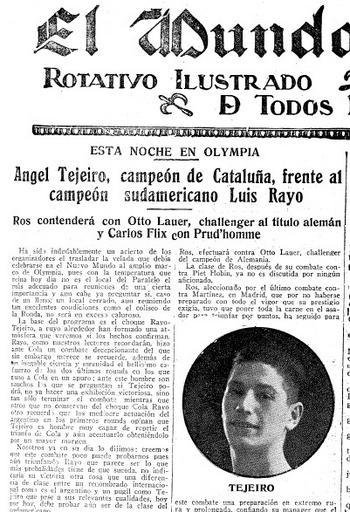 | Keywords: TEJEIRO RAYO.jpg en Newspaper cutting Mundo Deportivo june 10 1927 p1 fight between Angel Tejeiro and Luis Rayo es Recorte de periódico Mundo Deportivo 10 junio 1927 p1 combate entre Angel Tejeiro y luis Rayo own Tejeirosalguero2 1927 Boxing in Spain 1927 |