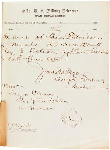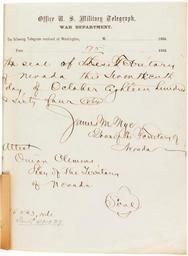 | Keywords: carson city carsoncity nevada statehood abraham lincoln abrahamlincoln u.s. national archives usnationalarchives nye nara:arcid=2642326 telegram Telegram from Nevada Territory Governor Nye to President Abraham Lincoln, 10/30/1864 U.S. National Archives' Local Identifier: MLR Number A1 912, A1 912-B Created by: Department of State. Office of the Secretary. (09/1789 - ) From: Series: Territorial Papers, compiled 1789 - 1873, documenting the period 1764 - 1873 (Record Group 59) Production Date: 10/30/1864 strong>Persistent URL: catalog.archives.gov/id/2642326 Repository: Textual Archives Services Division, National Archives at College Park (College Park, MD) Access Restrictions: Unrestricted Use Restrictions: Unrestricted Telegram from Nevada Territory Governor Nye to President Abraham Lincoln, 10/30/1864 U.S. National Archives' Local Identifier: MLR Number A1 912, A1 912-B Created by: Department of State. Office of the Secretary. (09/1789 - ) From: Series: Territorial Papers, compiled 1789 - 1873, documenting the period 1764 - 1873 (Record Group 59) Production Date: 10/30/1864 strong>Persistent URL: catalog.archives.gov/id/2642326 Repository: Textual Archives Services Division, National Archives at College Park (College Park, MD) Access Restrictions: Unrestricted Use Restrictions: Unrestricted |