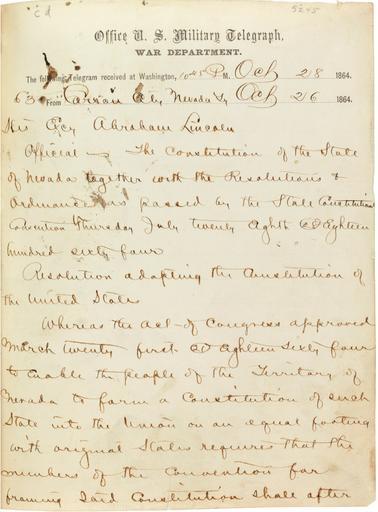 | Keywords: carson city carsoncity nevada statehood abraham lincoln abrahamlincoln u.s. national archives usnationalarchives nye nara:arcid=2642326 telegram lincoln president lincoln presidentlincoln document text monochrome writing Telegram from Nevada Territory Governor Nye to President Abraham Lincoln, 10/30/1864 U.S. National Archives' Local Identifier: MLR Number A1 912, A1 912-B Created by: Department of State. Office of the Secretary. (09/1789 - ) From: Series: Territorial Papers, compiled 1789 - 1873, documenting the period 1764 - 1873 (Record Group 59) Production Date: 10/30/1864 strong>Persistent URL: catalog.archives.gov/id/2642326 Repository: Textual Archives Services Division, National Archives at College Park (College Park, MD) Access Restrictions: Unrestricted Use Restrictions: Unrestricted Telegram from Nevada Territory Governor Nye to President Abraham Lincoln, 10/30/1864 U.S. National Archives' Local Identifier: MLR Number A1 912, A1 912-B Created by: Department of State. Office of the Secretary. (09/1789 - ) From: Series: Territorial Papers, compiled 1789 - 1873, documenting the period 1764 - 1873 (Record Group 59) Production Date: 10/30/1864 strong>Persistent URL: catalog.archives.gov/id/2642326 Repository: Textual Archives Services Division, National Archives at College Park (College Park, MD) Access Restrictions: Unrestricted Use Restrictions: Unrestricted |