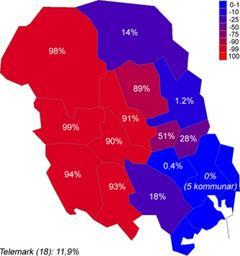 | Keywords: Telemark-2009 Nynorsk.png en The proportion of nynorsk in primary schools in the municipalities of Telemark Norway in 2009 no Andelen nynorsk skolemål i kommunene på Telemark i 2009 own Eivindgh 2010-05-01 Data source Statistics Norway Statistisk sentralbyrå Map source Norwegian Mapping Authority Linguistic maps of Norway Maps of Telemark |