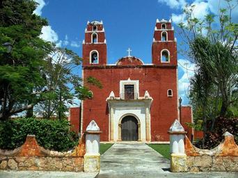 Keywords: temax mexico church building architecture sky clouds nature outside trees red