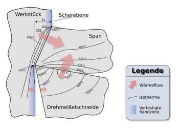 | Keywords: Temperaturverteilung hartmetalldrehmeissel.svg de Temperaturverteilung an einer Hartmetalldrehmeißelschneide P20 mit einer Schnittgeschwindigkeit von 60 m/min einer Spandicke h von 0 32 mm und einem Spanwinkel von 10 ° bei der Bearbeitung von Stahl Die in den Spanprozess eingebrachte Energie wird zu einem geringen Teil in die Verfestigung der Werkstückrandzone umgesetzt Auch der Herstellungsprozess des Rohteils Walzen Härten führt zu einer kaltverfestigten oder gehärteten Randzone Das Abtrennen dieser je nach Dicke und Beschaffenheit unterschiedlich festen Randzone steigert zusätzlich die Schnittkraft Die Temperaturen leiten sich wie folgt ab 75 in den Span 18 in das Werkzeug und 7 in das Werkstück Nach Vieregge G Zerspanung der Eisenwerkstoffe Stahleisen-Bücher Band 16 2 Auflage Düsseldorf Verlag Stahleisen m b H 1970 en Temperature distribution seen on a tungsten carbide turning tool grade P20 operating at a cutting speed of 60m/min chip thickness of 0 32mm and effective rake angle of 10° The forces created by the shearing process when a cutting tool drehmeißelschneide is guided through a workpiece werkstück which creates a chip span are taken by the tool and the toolholder on one side and on the other side by the workpiece itself This action creates a compressed surface at the blank after machining The compressed machined surface adds up to the larger cutting forces and is to be taken into account if the workpiece is to be machined a second time finishing The Temperature wärmefluss arising as a result of the chipping process from friction and mechanical deformation is dissipated as show 75 contained in the chip 18 tool 7 into the workpiece from Vieregge G Zerspanung der Eisenwerkstoffe Stahleisen-Bücher Band 16 2 Auflage Düsseldorf Verlag Stahleisen m b H 1970 selfmade Created with Inkscape 2006-09 David W PD Cutting forces Deformation |