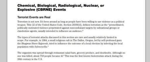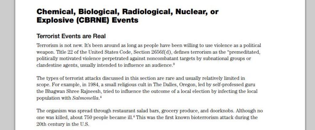 Keywords: Terrorist Events are Real.JPG 2012 edition of Crisis and Emergency Risk Communication Page 298 excerpt <br />Terrorism is not new It ™s been around as long as people have been willing to use violence as a political weapon Title 22 of the United States Code Section 2656f d defines terrorism as the premeditated politically motivated violence perpetrated against noncombatant targets by subnational groups or clandestine agents usually intended to influence an audience The types of terrorist attacks discussed in this section are rare and usually relatively limited in scope For example in 1984 a small religious cult in The Dalles Oregon led by self-professed guru the Bhagwan Shree Rajneesh tried to influence the outcome of a local election by infecting the local population with Salmonella The organism was spread through restaurant salad bars grocery produce and doorknobs Although no one was killed about 750 people became ill This was the first known bioterrorism attack during the 20th century in the U S On September 11 2001 several thousand people died from the air attacks on the World Trade Center the Pentagon and on the plane near Shanksville Pennsylvania Thousands more including first responders area residents and workers were exposed to potentially dangerous chemicals in the dust and ash clouds in Manhattan Even more suffered issues of stress including posttraumatic stress disorder PTSD and other mental health challenges The attacks on the World Trade Center and the Pentagon demonstrated today ™s role of public health workers in terrorist attacks Later in 2001 the well-known anthrax attacks took place This involved the intentional contamination of letters with this dangerous bacterium Seventeen people were infected and five of them died The attacks also created widespread social and economic disruption The attacks demonstrated to the public how an infectious disease could be used in a terrorist attack Public health professionals became central to the response Since that time CDC has paid even closer attention to reports involving viruses bacteria and toxins that might be used by terrorists to cause harm http //emergency cdc gov/cerc/pdf/CERC_2012edition pdf emergency cdc gov 2012 Centers for Disease Control and Prevention PD-US-Gov File 2012 Crisis and Emergency Risk Communication pdf Centers for Disease Control and Prevention publications 1984 Rajneeshee bioterror attack Bioterrorism PD-USGov