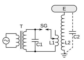 | Keywords: Tesla coil circuit.svg Tesla coil a spark-excited resonant transformer circuit invented in 1891 by Nikola Tesla It generates very high voltage radio frequency alternating current electricity at low current levels This is a modern unipolar version commonly used in entertainment coils with a toroidal-shaped metal capacitive load E on the high voltage terminal The primary circuit is shown connected to the primary winding L1 with a variable tap so that the primary and secondary coils can be adjusted to resonance C2 is not an actual capacitor but represents the capacitance of the secondary winding L2 plus the capacitance to ground of the toroidal electrode E 2015-07-27 own Chetvorno other versions cc-zero Uploaded with UploadWizard Tesla coil circuits |