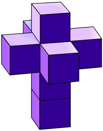 | Keywords: Tesseract2.svg Image of a three-dimensional net of a en tesseract created by en User Dmn with en Paint Shop Pro The net of a tesseract is the unfolding of a tesseract into 3-D space Let the dimension from left to right be labeled x the dimension from bottom to top be labeled z and the dimension from front to back be labeled y Let coordinates by x y z Let the top cube have coordinates 0 0 1 the cube below it have coordinates 0 0 0 the cube in front of it have coordinates 0 1 0 the cube behind it have coordinates 0 1 0 the cube to the left 1 0 0 the one to the right 1 0 0 Let the cube below the central one have coordinates 0 0 1 and the one at the bottom 0 0 2 The central cube 0 0 0 is seen to be connected to six other cubes but when folded in 4-D every cube connects to six other cubes The frontal cube 0 1 0 connects in the Y direction to 0 0 2 in the +Y direction to 0 0 0 in the +X direction to 1 0 0 in the X direction to 1 0 0 in the +Z direction to 0 0 1 in the Z direction to 0 0 1 There are twelve different ways in which the tesseract can be rotated in 4-D by 90 degrees in such a way that four of the cubes exchange positions cyclically while the remaining four cubes stay in place but rotate in 3-D For example one 4-D rotation causes the following four-cube exchange 0 0 1 0 0 0 0 0 1 0 0 2 0 0 1 Meanwhile the same rotation causes cube 0 1 0 to rotate 90 degrees around the +X axis the 0 1 0 cube to rotate 90 degrees around the X axis the 1 0 0 cube to rotate 90 degrees in the Y direction and the 1 0 0 cube to rotate 90 degrees in the +Y direction The twelve 4-D rotations are <br> 1 0 0 1 0 0 0 0 0 1 0 0 2 0 0 1 <br> 9 0 0 1 1 0 0 0 0 1 1 0 0 0 0 1 <br> 10 0 0 1 1 0 0 0 0 1 1 0 0 0 0 1 <br> 11 0 0 1 0 1 0 0 0 1 0 1 0 0 0 1 <br> 12 0 0 1 0 1 0 0 0 1 0 1 0 0 0 1 Each 4-D rotation has a dual which is perpendicular to the 3-D rotation of the stationary cubes There are six pairs of dual 4-D rotations <br> 1 4 <br> 2 3 <br> 5 12 <br> 6 11 <br> 7 9 <br> 8 10 <br> The dual of a 4-D rotation implies by means of the right-hand rule how the stationary cubes are supposed to rotate in 3-D Since there are eight cubes and each cube connects to six other cubes then each cube has a pair of cubes to which it does not connect 1 itself and 2 its opposite Thus there are four pairs of opposite cubes <br> 1 0 0 1 0 0 1 <br> 2 0 0 0 0 0 2 <br> 3 1 0 0 1 0 0 <br> 4 0 1 0 0 1 0 Each pair of opposite cubes aligns itself along opposite sides of one of four orthogonal axis of 4-D space Therefore it is possible to establish a one-to-one onto mapping f between the unfolded positions of the cubes in 3-D and the canonical coordinates of their folded positions in 4-D viz <math> f -1 0 0 \mapsto -1 0 0 0 -I </math> <math> f 1 0 0 \mapsto 1 0 0 0 I </math> <math> f 0 -1 0 \mapsto 0 -1 0 0 -J </math> <math> f 0 1 0 \mapsto 0 1 0 0 J </math> <math> f 0 0 1 \mapsto 0 0 1 0 K </math> <math> f 0 0 -1 \mapsto 0 0 -1 0 -K </math> <math> f 0 0 0 \mapsto 0 0 0 1 1 </math> <math> f 0 0 -2 \mapsto 0 0 0 -1 -1 </math> The canonical 4-D coordinates have been given labels corresponding to basis en quaternions and their negatives Using these labels the 4-D rotations can be expressed more simply as <br> 1 K 1 K 1 K <br> 2 K 1 K L K <br> 3 I J I J I <br> 4 I J I J I <br> 5 I 1 I 1 I <br> 6 I 1 I 1 I <br> 7 J 1 J 1 J <br> 8 J 1 J 1 J <br> 9 K I K I K <br> 10 K I K I K <br> 11 K J K J K <br> 12 K J K J K <br> All of these rotations follow a pattern A B A B A so that each one can be abbreviated as an ordered pair A B Then each rotation can be abbreviated furthest as the product of the ordered pair of quaternions which yields an imaginary quaternion <br> 1 K 1 K <br> 2 K 1 K <br> 3 I J K <br> 4 I J K <br> 5 I 1 I <br> 6 I 1 I <br> 7 J 1 J <br> 8 J 1 J <br> 9 K I J <br> 10 K I J <br> 11 K J I <br> 12 K J I <br> The pairs of dual quaternions are then seen to have the following properties the products of their single-quaternion abbreviations are always unity <br> 1 4 K K 1 <br> 2 3 K K 1 <br> 5 12 I I 1 <br> 6 11 I I 1 <br> 7 9 J J 1 <br> 8 10 J J 1 <br> Each of the twelve rotations has a pair of candidate duals but one of them is the reversal of the rotation i e given rotation A B its reverse is A B so it is disqualified as the dual of A B leaving only one possible dual See above text taken from cited source File Tesseract2 png 2007-04-01 Traced by User Stannered PD original File Tesseract2 png File Tesseract net Crooked House svg en English Wikipedia Dmn Created with Inkscape Tesseract nets |