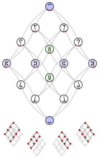 | Keywords: Tesseract Hasse diagram with nibble shorthands; like 4x4 matrix.svg Tesseract Hasse diagram with Boolean alphabet signs The vertices are arranged like the fields of a 4x4 matrix Inkscape ValidSVG own Mate2code Compare 200px 300px 200px Tesseract Hasse diagrams 4x4 matrices representing tesseracts Colored nibbles blue green white Nibble shorthands Duality A filled with B's filled with scalars reversing A and B | ||||