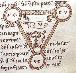 | Keywords: Tetragrammaton-Trinity-diagram-12thC.jpg A diagram on the Tetragrammaton divine four-letter name YHWH Hebrew יהוה ” or IEVE as it's transcribed into the Latin language here ” as a foundation of the Christian Trinity This is taken from a 12th-century manuscript of the ca 1109 A D work Dialogi Contra Iudaeos Dialogues against the Jews by Petrus Alphonsi / Petrus Alfonsi / Peter Alfonsi a convert to Christianity from Judaism The diagram shows the three persons of the Christian Trinity assigned to the three possible consecutive two-letter sequences of the Tetragrammaton YHWH / IEVE ” namely IE EV and VE These three sequences are in three circular nodes connected to each other by three lines making a triangle In the center supported by fanciful animals is a scroll with the complete Tetragrammaton The fanciful animals would not have been present in Petrus Alfonsi's original version of the diagram but were probably a personal decorative addition by the scribe who copied out this particular manuscript of the Dialogues The current-day relevance of this diagram is mainly that it influenced the development of the later Shield of the Trinity or Scutum Fidei diagram as well as influencing Joachim of Fiore's own different IEUE interlaced circles diagram which in turn led to the use of the Borromean rings as a symbol of the Christian Trinity http //www liv ac uk/~spmr02/rings/trinity html This is a cropped version of the image on page http //www joh cam ac uk/library/special_collections/manuscripts/medieval_manuscripts/medman/A/Web 20images/E4f153v htm which is a scan from folio 153v of Manuscript E 4 in the collection of the library of St John's College Cambridge University England This manuscript is referred to as manuscript J1 among the many surviving manuscripts of the Dialogus adversus Judaeos in the book Petrus Alfonsi and his Medieval Readers by John Victor Tolan 1993 ISBN 0813012384 century 12 unknown 12th century scribe For a different version of this diagram see File ALFONSI PETRUS 1110 Dialogi contra Iudaeos TETRAGRAMMATON Migne Vol 157 png See also http //www joh cam ac uk/library/special_collections/manuscripts/medieval_manuscripts/medman/A/Web 20images/D11f38v htm IEVE here PD-old-100 12th-century illuminated manuscripts Cambridge University Library manuscripts Trinity symbols Medieval diagrams Tetragrammaton |
