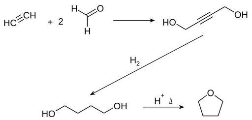 Keywords: Tetrahydrofuran synthesis01.svg en Synthesis of tetrahydrofuran Reppe process de Synthese von Tetrahydrofuran Reppe-Prozess own Steffen 962 2012-03-16 PD-chem Tetrahydrofuran Cc-zero