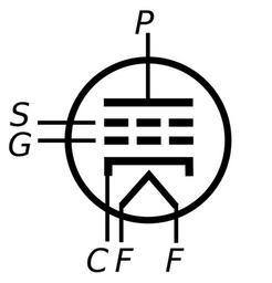 Keywords: Tetrode symbol labeled.svg tetrode vacuum tube F filament or heater C cathode G control grid S screen grid P plate 2013-06-26 07 41 57 own Chetvorno cc-zero Uploaded with UploadWizard Vacuum tube symbols
