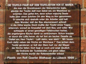 | Keywords: Teufel an der Marienkirche Lübeck, plaquette with its story.jpg en Plaquette with the story about the Teufelsstein von St Marien engl Devils stone of St Marien When starting building St Marien the devil was helping to raise the walls for he thought this would become an orphans home - a place where it would be easy for the devil to earn some souls When it recognized it was mistaken the devil angrily threw a long stone to burst the new walls But one of the workers stopped the throw by promising to build a tavern in the very neighborhood of the church which the devil agreed and landed the stone right at the new churches walls leaving some clear to be seen scratches of its claws on it In fact the Ratsweinstube was erected close by as the tavern of the major and the members of his government de Tafel mit der Kurzfassung der Legende vom Teufelsstein von St Marien auf dem die Statue sitzt Die Tafel hängt an der Außenmauer der Kirche in unmittelbarer Nähe von Stein und Figur own Unscheinbar; statue by Rolf Goerler 1999 2012-05-02 File Der Teufel an der Marienkirche in Lübeck Plastik von Rolf Goerler 1999 jpg Cc-zero Marienkirchhof Lübeck Sculptures in Lübeck Rolf Goerler Statues of the Devil |