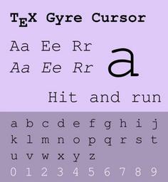 Keywords: TeX Gyre Cursor.svg en Specimen of the typeface TeX Gyre Cursor own font faces by the GUST e-foundry Pythagoras1 SVG typeface specimen samples