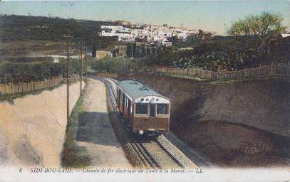 Keywords: Tgm sidi bou said.jpg Entre Carthage et La Marsa voie unique jusqu'en 1937 Collection personnelle Bertrand Bouret http //profburp com PD-Tunisia Sidi Bou Said Postcards of TGM