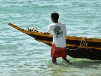 Keywords: thai fishing boat person boy male thailand asia tropical island koh tao sairee beach longtail long-tail