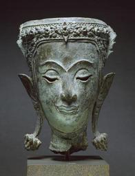Keywords: Thai - Head of the Crowned Buddha - Walters 542542.jpg The most heavily bejeweled crowned Buddhas-sometimes seated more frequently standing-were made in the second half of the 17th century Some like these appear to be the product of the royal workshops in Ayutthaya at a time when the absolute power of the king was also great The facial features have a tension seen also in the flickering ornament on the back 2nd half Other date century 17 leaded tin brass cm 15 accession number 54 2542 6460 Nakhon Kasem Bangkok Alexander B Griswold Monkton 1946 by purchase presented to the Breezewood Foundation inv no 537 Walters Art Museum Gift of A B Griswold 1979 none Recent Accessions The Walters Art Gallery Baltimore 1981 Unearthly Elegance Buddhist Art from the Griswold Collection The Walters Art Gallery Baltimore 1995 The Kingdom of Siam Arts of Central Thailand 1350-1800 Asian Art Museum San Francisco; Peabody Essex Museum Salem 2005-2006 place of origin Ayutthaya Thailand Walters Art Museum license Thai sculptures in the Walters Art Museum Art of Ancient Thailand Media contributed by the Walters Art Museum needs category review |