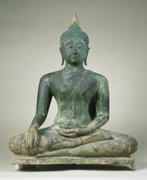 | Keywords: Thai - Seated Buddha in "Maravijaya" - Walters 542520.jpg In parts of Thailand a Buddha image is traditionally consecrated at dawn Wax covering the eyes of the image is removed and the sun's first rays breaking through the eastern entrance doors of the temple strike the golden image Meanwhile monks chant a verse proclaiming that one who knows the truth as taught by the Buddha can ward off evil just as the dawn drives away darkness and fills the air with light The consecration of the image is a reenactment of another event that occured at dawn Sakyamuni Buddha's final victory over evil some 2500 years ago in India The Buddha at this time of his victory is the subject of this image and of almost every primary image in the monastaries of Thailand The Buddha's right arm is lowered in the gesture that brought forth a flood that carried away the evil forces The waters of the oceans comprimised this flood and they were equivalent to the good deeds the Buddha had performed in his past lives The Thai of Sukhothai developed a new curvilinear style of image in the 14th century which is now looked upon as classic 2nd half Other date century 14 Sukhothai leaded bronze cm 71 55 accession number 54 2520 15634 Luang Ban Alexander B Griswold Monkton April 17 1949 presented to the Breezewood Foundation 1964 inv no 637 Walters Art Museum under the auspices of the Breezewood Foundation Gift of the Breezewood Foundation 1977 Unearthly Elegance Buddhist Art from the Griswold Collection The Walters Art Gallery Baltimore 1995 place of origin Sukhothai Thailand Walters Art Museum license Thai sculptures in the Walters Art Museum Art of Ancient Thailand Media contributed by the Walters Art Museum needs category review |
