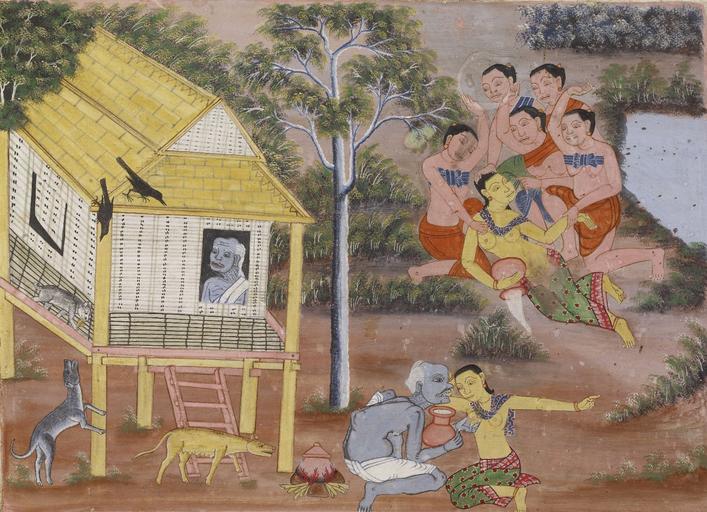 | Keywords: Thai - Vessantara Jataka, Chapter 5 (Jujaka) - Walters 35250 - A T Front.jpg The old brahmin Jujaka is poor but has a young beautiful wife named Amittatapana When Amittatapana goes to fetch water the village women mock her for being married to an old man She pleads with Jujaka to ask Vessantara for his children so that they can come and do her work and she threatens to leave her husband unless her wish is granted Amittatapana is seen getting teased and then returning to tell Jujaka her demand Jujaka is also depicted twice sitting in his small house and receiving the water from his wife ca 1920 1940 Bangkok paint cloth cm 52 5 66 5 accession number 35 250 16384 Doris Duke Charitable Foundation's Southeast Asian Art Collection date and mode of acquisition unknown Walters Art Museum Gift from Doris Duke Charitable Foundation's Southeast Asian Art Collection 2002 place of origin Thailand Walters Art Museum license 2D Vessantara Jataka Thai paintings in the Walters Art Museum Art of Ancient Thailand Media contributed by the Walters Art Museum needs category review |