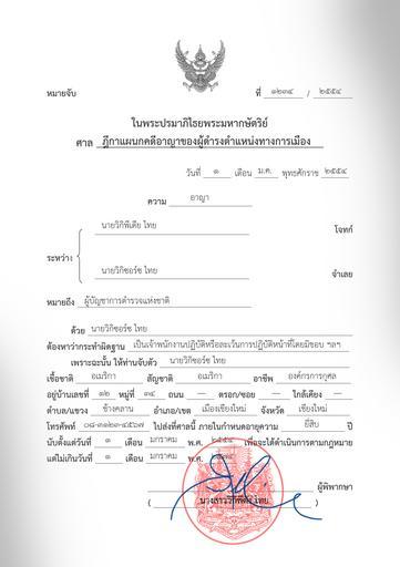 | Keywords: Thai Warrant of Arrest (Filled) - 003.jpg en An example of a filled and signed warrant of arrest according to the Ordinance of the President of the Supreme Court of Justice on Criteria and Procedure for Issuance of Criminal Rulings or Warrants BE 2548 2005 ข้อบังคับของประธานศาลฎีกา ว่าด้วยหลัก กณฑ์และวิธีการ กี่ยวกับการออกคำสั่งหรือหมายอาญา พ ศ ๒๕๔๘ issued under the Thai Code of Criminal Procedure 1935 <br> The main text reads <blockquote> To the National Police Commander <br><br>WHEREAS Mr Wikisource THAI is accused of whilst being a public officer unlawfully performing or refraining from a public duty etc <br><br>YOU ARE HEREBY COMMANDED to arrest the said Mr Wikisource THAI who is of American Nationality is of American Race is a member of a charitable organisation and resides at No 12 Mu 31 Thanon - Trok/Soi - adjacent to - Tambon/Khwaeng Chang Khlan Amphoe/Khet Mueang Chiang Mai Changwat Chiang Mai Tel 08-3123-4567 and to bring him before this Court within twenty-year prescription which shall be counted from 1 January 2011 to 1 January 2031 so that the mentioned person would be dealt with according to the law <br><br>Signed and Sealed Ms Wikipe-tan THAI Judge </blockquote> th ตัวอย่างหมายจับที่กรอกข้อมูลแล้ว ตาม ข้อบังคับของประธานศาลฎีกา ว่าด้วยหลัก กณฑ์และวิธีการ กี่ยวกับการออกคำสั่งหรือหมายอาญา พ ศ ๒๕๔๘ ซึ่งออกตามความใน ประมวลกฎหมายวิธีพิจารณาความอาญา ไทย พ ศ ๒๔๗๘ 2011-05-19 own Aristitleism cc-zero Uploaded with UploadWizard Police of Thailand Judiciary of Thailand Arrests |