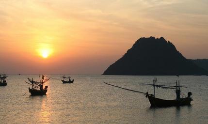 Keywords: thailand harbor seaside boat sea seashore bay dawn sunrise serene peaceful fishing boat cove water