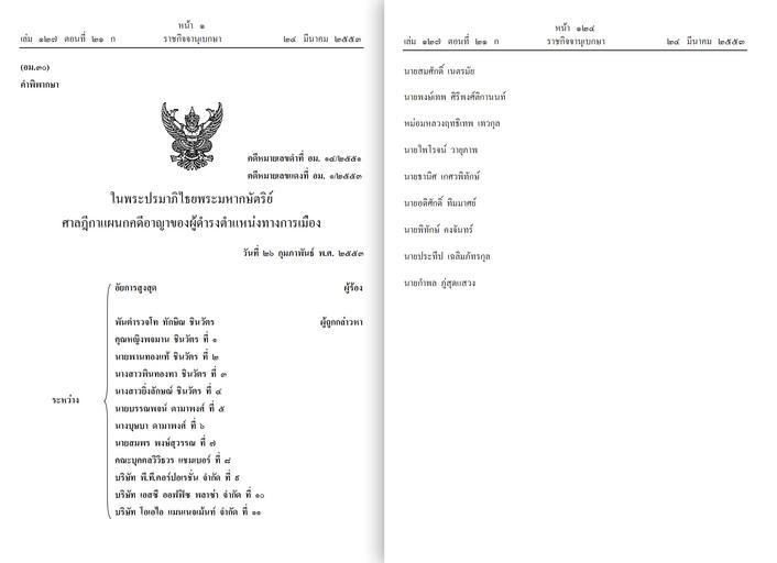| Keywords: ThaksinConfiscationJudgment-InGovernmentGazette-FirstandLastPages.jpg en The first and last pages of the Government Gazette Volume 127/Part 21 A/Page 1-124/Dated March 24 2010 on which the Judgment of the Supreme Court of Thailand's Criminal Division for Holders of Political Positions in the Black-Number Case No CDHPP 14/2551 and the Red-Number Case No CDHPP 1/2553 'Attorney-General v Thanksin Shinawatra et al ' was published The pictures are pages of judicial decision which is not a copyright-work under Thailand's Copyright Act BE 2537 1994 th หน้าต้นและหน้าท้ายของ ราชกิจจานุ บกษา ฉบับที่ ๑๒๗/ตอนที่ ๒๑ ก/หน้า ๑-๑๒๔/ลงวันที่ ๒๔ มีนาคม ๒๕๕๓ ซึ่งลงประกาศ คำพิพากษาศาลฎีกาแ นกคดีอาญาของ ู้ดำรงตำแหน่งทางการ มือง ในคดีหมาย ลขดำที่ อม ๑๔/๒๕๕๑ และคดีหมาย ลขแดงที่ อม ๑/๒๕๕๓ ระหว่าง อัยการสูงสุด กับพันตำรวจโททักษิณ ชินวัตร กับพวก ภาพนี้ ป็นส่วนหนึ่งของคำวินิจฉัยขององค์กรตุลาการไทย ซึ่งมิใช่งานอันมีลิขสิทธิ์ตามพระราชบัญญัติลิขสิทธิ์ พ ศ ๒๕๓๗ own Clumsy 2010-04-19 PD-TH-exempt Thaksin Shinawatra's assets confiscation case |
