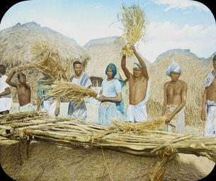 | Keywords: Tharus beating out the rice from the ears, Harnatar, India, ca. 1906 (IMP-CSCNWW33-OS14-51).jpg en <br> Tharus beating out the rice from the ears Harnatar India ca 1906 Tinted lantern slide featuring a group of men from the Tharu ethnic group beating the stems of rice plants to extract the grains in Harnatar a village in the Siwan district of Bihar India The men stand behind a large rock covered with wooden logs on which they beat the plants The men wear traditional dress and some men wear wraps around their waists The Tharu people are an ethnic group indigenous to the southern foothills of the Himalayas in Nepal This slide comes from a collection created by missionaries from Regions Beyond Missionary Union an interdenominational Protestant evangelical mission working in northeast India Bihar and Orissa and Nepal Photographer Unknown Filename IMP-CSCNWW33-OS14-51 tif Coverage date 1900/1910 Subject unesco Agriculture Part of collection International Mission Photography Archive ca 1860-ca 1960 Part of subcollection Photographs from the Centre for the Study of World Christianity University of Edinburgh U K ca 1900-ca 1940s Repository name Centre for the Study of World Christianity Archival file Volume3/IMP-CSCNWW33-OS14-51 tif Geographic subject city or populated place Siwan Repository address The University of Edinburgh School of Divinity New College Mound Place Edinburgh EH1 2LX United Kingdom Geographic subject country India Format aacr2 lantern slides 8 2 x 8 2cm Geographic subject continent Asia Rights Contact the repository for details Part of series Regions Beyond Missionary Union India captioned lantern slides CSCNWW33/OS14 Repository email divinity-CSWC ed ac uk Date created 1900/1910 Publisher of the digital version University of Southern California Libraries Subject aat genre group portraits Format aat lantern slides; photographs Geographic subject state Bihar Access conditions http //www ed ac uk/schools-departments/divinity/research/centres/world-christianity/collections-resources Geographic subject populated places File CSCNWW33/OS14/51 Subject lcsh Rice; Rice workers; Tharu South Asian people 1900/1910 date created author http //digitallibrary usc edu/cdm/ref/collection/p15799coll123/id/78267 PD-old-70-1923 Magic lantern images Images from USC Digital Library uploaded by Fæ International Mission Photography Archive ca 1860-ca 1960 Rice threshing |