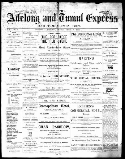 | Keywords: The Adelong and Tumut Express and Tumbarumba Post 6 April 1900.PNG en The front page of the Adelong and Tumut Express and Tumbarumba Post on 6 April 1900 2013-05-22 14 26 50 http //trove nla gov au/ndp/del/title/434 Adelong and Tumut Express and Tumbarumba Post Custom license marker 2013 05 22 PD-Australia Uploaded with UploadWizard Newspapers of New South Wales Newspapers digitized by the National Library of Australia | ||||