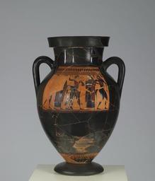 | Keywords: The Affecter - Black-Figure Amphora - Walters 4811 - Side A.jpg The vase painter known as The Affecter had a long career beginning before 550 BC and lasting into the 520s His style is one of the most easily recognized in all of Greek vase-painting characterized by thick figures with tiny heads and exaggerated angular joints Both sides of the amphora show scenes of the messenger-god Hermes leading the wine-god Dionysus towards a woman perhaps Ariadne wife of Dionysus who welcomes them in the company of satyrs ca 540 530 BC Archaic terracotta cm 60 27 accession number 48 11 28180 Don Marcello Massarenti Collection Rome no 218 Henry Walters city Baltimore Walters Art Museum Henry Walters Acquired by Henry Walters with the Massarenti Collection 1902 Undercover Stories in Art The Walters Art Gallery Baltimore 1980 place of origin Athens Greece Walters Art Museum license Ancient Greek black-figure pottery in the Walters Art Museum The Affecter Media contributed by the Walters Art Museum needs category review |
