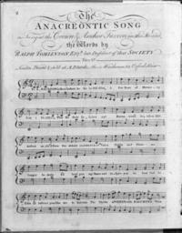 | Keywords: The Anacreontic Song page1.jpg The Anacreontic Song as Sung at the Crown Anchor Tavern in the Strand <br /> The Words by Ralph Tomlinson Esq<sup>r</sup> late President of that Society <br /> Price 6<sup>d</sup> <br /> London Printed Sold at A Blands Music Warehouse 23 Oxford Street </blockquote> This song is by and for a London musicians' society in glory of Bacchus god of wine and Venus goddess of love after the Greek poet Anacreon The members of this society could continue to drink wine if they were able to sing this song The tavern where they sang was probably at Arundel Street in the Strand The music was reused with other lyrics in two patriotic songs with no relation to drunkenness or sex the former anthem of Luxembourg and the present anthem of the United States of America The Anacreontic Song la chanson anacréontique en référence à Anacréon un poète Grec aimant le vin et l'amour Les paroles ont été écrites par et pour la société anacréontique club de musiciens londoniens Cette chanson est une ode à Bacchus dieu du vin et à Vénus déesse de l'amour Les musiciens pouvaient reprendre du vin si ils arrivaient à chanter correctement un couplet de cette chanson La musique a été réutilisée avec des paroles différentes dans deux chansons patriotiques n'ayant aucun rapport avec l'ivresse ni le sexe l'ancien hymne du Luxembourg et l'actuel hymne des États-Unis d'Amérique circa 1790 http //lcweb2 loc gov/diglib/ihas/loc natlib ihas 100010458/default html Poem by Ralph Tomlinson music by John Stafford Smith printed circa 1790 by A Bland's Music Warehouse London File The Anacreontic Song page1 mid Custom license marker 2012 07 24 PD-scan Uploaded with UploadWizard The Star-Spangled Banner Love in music To Anacreon in Heaven |
