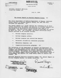 | Keywords: The Annual Report on Nuclear Weapons Surety - NARA - 198337.jpg Scope and content General notes 198337 Local identifier President 1981-1989 Reagan National Security Council 1981 - 1989 Ronald Reagan Library NLRR 40 Presidential Drive Simi Valley CA 93065-0600 1986-07-08 Record group Collection RR-NSC Numbered National Security Policy Papers 1981 - 1989 Record group ARC 1189 National Security Decision Directives compiled 02/25/1981 - 01/19/1989 Series ARC 198166 File unit File unit ARC Variant control numbers NAIL Control Number NLS-NSC-NSDD-230 Other versions <gallery> File The_Annual_Report_on_Nuclear_Weapons_Surety_-_NARA_-_198337 tif tif File The_Annual_Report_on_Nuclear_Weapons_Surety_-_NARA_-_198337 jpg jpg </gallery> NARA-cooperation PD-USGov Presidential Decision Directives Reagan |