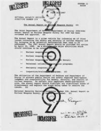 | Keywords: The Annual Report on Nuclear Weapons Surety - NARA - 198376.jpg Scope and content General notes 198376 Local identifier President 1981-1989 Reagan National Security Council 1981 - 1989 Ronald Reagan Library NLRR 40 Presidential Drive Simi Valley CA 93065-0600 1987-06-16 Record group Collection RR-NSC Numbered National Security Policy Papers 1981 - 1989 Record group ARC 1189 National Security Decision Directives compiled 02/25/1981 - 01/19/1989 Series ARC 198166 File unit File unit ARC Variant control numbers NAIL Control Number NLS-NSC-NSDD-279 Other versions <gallery> File The_Annual_Report_on_Nuclear_Weapons_Surety_-_NARA_-_198376 tif tif File The_Annual_Report_on_Nuclear_Weapons_Surety_-_NARA_-_198376 jpg jpg </gallery> NARA-cooperation PD-USGov Presidential Decision Directives Reagan |