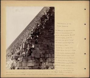 | Keywords: The Ascent of the Great Pyramid by Boston Public Library.jpg Scrapbook page containing one photograph of people climbing up the side of the Pyramid of Cheops in Egypt annotated with information about the process of climbing and the view from the top Subjects Egypt travel photography pyramids tombs Jīzah Ahrāmāt al- Page size 33 x 38 1 cm Annotations Two Bedouins are necessary and three are desirable for each person who climbs the Pyramid The accompany pictures give some idea of the size of the blocks and the difficulty of surmounting them At the top is a space about 30 feet square The view is unique In one direction are barren cliffs in another yellowish brown and glaring tracts of sand Below is the Sphinx and the other two Pyramids farther away the Pyramids of Abusîr- Sakkâra and Dashur- Towards the east are the east are the long avenues of lebbek trees the river Nile with luxuriant vegetation along its banks fields intersected with canals bordered by stately palms shadowing fellah villages and far away Cairo with glittering mosques and minarets Language English photograph has French title Rights No known restrictions Coverage Egypt Notes Title supplied by cataloger derived from captions or annotated information Format Scrapbooks Technique Photographs Albumen prints BPL Department Print Department Photo 1 Photographer Sébah J Pascal Title 229 Pyramide Chèops Ascension Caption The Ascent of the Great Pyramid Date ca 1860-1890 Flickr data on 2011-08-03 Camera Sinar AG Sinarback 54 FW Sinar m License CC BY 2 0 User Boston Public Library BPL Flickr http //flickr com/photos/24029425 N06/2468305153 The Ascent of the Great Pyramid December 21 1892 March 8 1893 Flickr upload date 2008-05-01 17 11 03 William Vaughn Tupper Flickr uploader http //www flickr com/people/24029425 N06 BPL User Flickr upload bot/upload 14 48 3 August 2011 UTC Fæ CC BY 2 0 PD-old-100 Historical images of Great Pyramid 1890s Tupper Scrapbooks volume 26 Lower Egypt Climbing the Great Pyramid of Giza 1890s Photos uploaded from Flickr by Fæ using a script Bedouins in Egypt Jean Pascal Sebah |