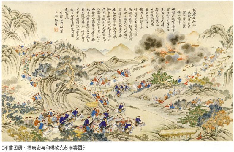 Keywords: The Battle of Simazhai.jpg en A scene of the Chinese Campaign against the Miao Hunan 1795 zh-hans 平定苗疆战役之 攻克苏麻寨 http //www battle-of-qurman com cn/e/hist htm late XVIII century A collaboration between Chinese and European painters The Jesuit missionaries involved in producing the drawings in China were Giuseppe Castiglione Jean-Denis Attiret Ignace Sichelbart and Jean Damascene The engravings were executed in Paris under the direction of Charles-Nicolas Cochin of the Académie Royal at the Court of Louis XVI and the individual engravers include Le Bas Aliamet Prevot Saint-Aubin Masquelier Choffard and Launay PD-Art Military of Qing China Ten Great Campaigns Paintings of the Qing Dynasty |