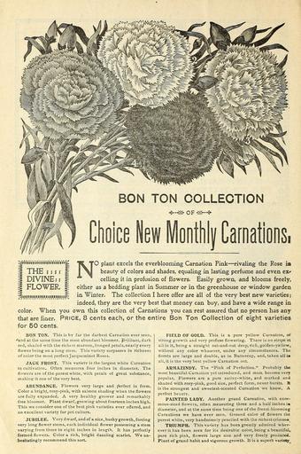 | Keywords: The best homes in America plant my flowers, why not you? (16387573701).jpg BON TON COLLECTION <br> ~ 3K- OF - -~ <br> lYmYrVmtfr'iYirtrV <br> THE s t i t <br> DIVINE ; t <br> FLOWER <br> color When you <br> that are finer PRI <br> for 50 cents <br> Choice New Monthly Carnations <br> NO plant excels the everblooming Carnation Pink rivaling the Rose in <br> beauty of colors and shades equaling in lasting perfume and even ex <br> celling it in profusion of flowers Easily grown and blooms freely <br> either as a bedding plant in Summer or in the greenhouse or window garden <br> in Winter The collection I here offer are all of the very best new varieties ; <br> indeed they are the very best that money can buy and have a wide range in <br> own this collection of Carnations you can rest assured that no person has any <br> ce 8 cents each or the entire Bon Ton Collection of eight varieties <br> BON TON This is by far the darkest Carnation ever seen <br> 'and at the same time the most abundant bloomer Brilliant dark <br> red shaded with the richest maroon fringed petals nearly every <br> flower being on a long stem This variety surpasses in richness <br> of color the most perfect Jacqueminot Roses <br> JACK FROST This variety is the largest white Carnation <br> in cultivation Often measures four inches in diameter The <br> flowers are of the purest white with petals of great substance <br> making it one of the very best <br> ABUNDANCE Flowers very large and perfect in form <br> Color a bright rosy-pink with salmon shading when the flowers <br> are fully expanded A very healthy grower and remarkably- <br> free bloomer Plant dwarf growing about fourteen inches high <br> This we consider one of the best pink varieties ever offered and <br> an excellent variety for pot culture <br> JUBILEE Very dwarf and of a nice bushy growth forcing <br> very long flower stems each individual flower possessing a stem <br> varying from three to eight inches in length It has perfectly <br> formed flowers Color a rich bright dazzling scarlet We un- <br> hesitatingly recommend this sort <br> FIELD OF GOLD This is a pure yellow Carnation of <br> strong growth and very profuse flowering There is no stnpe at <br> all in it being a straight out-and-out deep rich golden-yellow <br> without any color whatever under any circumstances The <br> florets are large and double as in Buttercup and taken all is <br> all it is the very best yellow Carnation out <br> ARMAZINDY The Pink of Perfection Probably the <br> most beautiful Carnation yet introduced and must become very <br> popular Flowers are a pure satiny-white and marked and <br> shaded with rosy-pink good size perfect form never bursts R <br> is the strongest and sweetest-scented Carnation we know A <br> perfect beauty <br> PAINTED LADY Another grand Carnation with enor- <br> mous-sized flowers olten measuring three and a half inches is <br> diameter and at the same time being one of the freest-blooming <br> Carnations we have ever seen Ground color of flowers the <br> purest white very handsomely penciled with the richest crimson <br> TRIUMPH This variety has been greatly admired wher- <br> ever it has been seen for its desirable color being a beautiful <br> pure rich pink flowers large size and very freely produced <br> Plant of grand habit and vigorous growth It is a superb variety 41847001 130961 64578 Text http //www biodiversitylibrary org/page/41847001 1899 10 5962/bhl title 64578 Ella V Baines Firm ; Henry G Gilbert Nursery and Seed Trade Catalog Collection Biodiversity Heritage Library Miss Ella V Baines the Woman Florist Springfield Ohio The best homes in America plant my flowers why not you Garden Stories Bulbs Plants Catalogs Flowers Plants Ornamental Seed industry and trade Seeds Trade catalogs U S Department of Agriculture National Agricultural Library bhl page 41847001 dc identifier http //biodiversitylibrary org/page/41847001 bhlGardenStories BHLinbloom bulbs plants plants ornamental u s department of agriculture national agricultural library bhlgardenstories bhlinbloom Information field Flickr posted date ISOdate 2015-01-28 CC-BY-2 0 BioDivLibrary https //flickr com/photos/61021753 N02/16387573701 2015-08-24 07 51 33 cc-by-2 0 PD-old-70-1923 Photos uploaded from Flickr by FĂŚ using a script The best homes in America The best homes in America plant my flowers, why not you? (16387573701).jpg BON TON COLLECTION <br> ~ 3K- OF - -~ <br> lYmYrVmtfr'iYirtrV <br> THE s t i t <br> DIVINE ; t <br> FLOWER <br> color When you <br> that are finer PRI <br> for 50 cents <br> Choice New Monthly Carnations <br> NO plant excels the everblooming Carnation Pink rivaling the Rose in <br> beauty of colors and shades equaling in lasting perfume and even ex <br> celling it in profusion of flowers Easily grown and blooms freely <br> either as a bedding plant in Summer or in the greenhouse or window garden <br> in Winter The collection I here offer are all of the very best new varieties ; <br> indeed they are the very best that money can buy and have a wide range in <br> own this collection of Carnations you can rest assured that no person has any <br> ce 8 cents each or the entire Bon Ton Collection of eight varieties <br> BON TON This is by far the darkest Carnation ever seen <br> 'and at the same time the most abundant bloomer Brilliant dark <br> red shaded with the richest maroon fringed petals nearly every <br> flower being on a long stem This variety surpasses in richness <br> of color the most perfect Jacqueminot Roses <br> JACK FROST This variety is the largest white Carnation <br> in cultivation Often measures four inches in diameter The <br> flowers are of the purest white with petals of great substance <br> making it one of the very best <br> ABUNDANCE Flowers very large and perfect in form <br> Color a bright rosy-pink with salmon shading when the flowers <br> are fully expanded A very healthy grower and remarkably- <br> free bloomer Plant dwarf growing abo