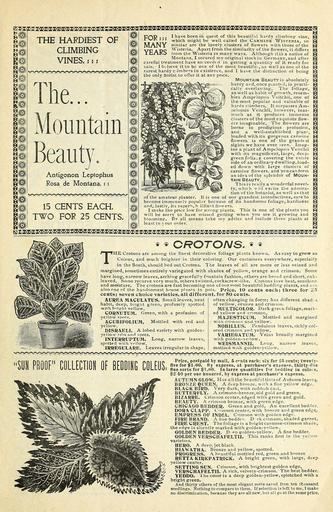 | Keywords: The best homes in America plant my flowers, why not you? (16363338876).jpg THE HARDIEST OF <br> CLIMBING <br> Ea S88 SSaSSSEBHB3SSSSX 3 5 <br> VINES s s s <br> The <br> Mountain <br> Beauty <br> Antigonon Leptophus <br> Rosa de Montana s <br> 15 CENTS EACH <br> TWO FOR 25 CENTS <br> ˘ – <br> FOR <br> I have been in quest of this beautiful hardy climbing vine <br> which might be well called the Carmine Wisteria so <br> MANY similar are the lovely clusters of flowers with those of the <br> VC A PC W' ster ' a ' Apart from the similarity of the flowers it differs <br> YcAKo irom the Wisteria in many ways Although it is a native of <br> Montana I secured my original stock in Germany and after <br> careful treatment have surcecdi ri in getting a quantity of it ready for <br> sale I believe it to be one of the most beautiful as well as one ot the <br> rarest hardy Climbers in existence and I have the distinction of being <br> the only florist to offer it at any price <br> Mountain Beauty is absolutely <br> hardy and once pianted is practi- <br> cally everlasting The foliage <br> as well as habit of growth resem- <br> bles Ampelopsis Veitchii one of <br> the most popular and valuable of <br> hardy climbers It surpasses Am- <br> pelopsis Veitchii however inas- <br> much as it produces immense <br> clusters of the most exquisite flow- <br> ers imaginable The flowers are <br> borne in prodigious profusion <br> and a well-established plam <br> loaded with its gorgeous carmine <br> flowers is one of the grandtst <br> sights we have ever seen Imag- <br> ine a plant of Ampelopsis Veitchii <br> with its magnificent laige deep- <br> green folia-e covering the entire <br> side of an ordinary dweIling load- <br> ed down with large clusters of <br> carmine flowers and yon can form <br> an idea of the splendor of MOUN- <br> TAIN Beauty <br> This is really a wonderful novel- <br> tv; which will excite the admira- <br> tion of the botanist as well as that <br> of the amateur planter It is one of our grandest introductions sure'to <br> become immensely popular because of its handsome foliage hardiness <br> and lastly its superh b illiant flowers <br> I make the price low for strong plants This is one of the plants you <br> will be sorry to have missed getting when you see it growing and <br> blooming Bv all means take my advice and include three plants at <br> least in \ our order <br> \ SSiX SSi St I SSSS S ZS3SiS S3 SS SSSZWSS SSXSXSS <br> GROTONS <br> THE Crotons are among the finest decorative foliage plants known As easy to grow as <br> Coieus and much brighter in their coloring Our customers everywhere especially <br> in the South should bed out Crotons The leaves of all are more or less veined and <br> margined sometimes entirely variegated with shades of yellow orange and crimson Some <br> have long narrow leaves arching gracefully fountain fashion others are broad and short oak- <br> leaved Some recurve very much' others twisted corkscrew-like Crotons love heat sunshine <br> and moisture The crotons are fast becoming one of our most beautiful bedding plants and are <br> also one of the handsomest house plants in pots Price 10 cents each; three for 2-5 <br> cents; seven choice varieties all different for 50 cents <br> AUREA MACULATUS Small leaves neat often changing in form; has different shad- s <br> habit deep bright green profusely spotted <br> with brio-ht vellow <br> CORNUTUM Green with a profusion of <br> yellow spots <br> ACUBIFOLIUM Mottled with red and <br> yellow <br> DISRAELI A lobed variety with golden- <br> yellow ribs and spots <br> INTERRUPTUM Long narrow leaves <br> spotted with vellow <br> IRREGULARE Leaves irregular in shape <br> of vellow orange and crimson <br> MULTICOLOR Dark green foliage mark- <br> ed yellow and crimson <br> MAJESTICUM Mottled and margined <br> with crimson and veilow <br> NOBILLUS Pendulous leaves richly col- <br> ored crimson and yellow <br> VARIEGATUM Veins broadly margined <br> – with golden-vellow <br> WEISMANNII Long narrow leaves <br> mottled with golden-yellow <br> 'SUN PROOF COLLECTION OF BEDDING COLEOS <br> Price postpaid by mail 5 cnts each; six for '25 cents; twenty- <br> flye for 1 00 By express at purchaser's expen»e thirty-fire <br> I fine sorts for 1 10 In large quantities for beddiner in colors <br> 2 60 per one hundred by express at purchaser's expense <br> AUTUMN GLOW Has all the beautiful tints of Autumn leave <br> BRONZE QUEEN A deep bronze with a fine yellow edge <br> BLACK BIRD Very dark with reddish cast <br> BUTTERFLY A crimson-bronze old gold and green <br> BIZARRE Crimson center edged with green and gold <br> BEAUTY A crimson bronze with green edge <br> CHICAGO BEDDER Green and gold An excellent bedder <br> DORA CLAPP Crimson center with bronze and green edge <br> EMPRESS OF INDIA Crimson with golden edge <br> FIREBRAND A fine bedder D rk crimson shaded garnet <br> FIRE CREST The foliage is a brightcarmine-crimson shade <br> the edge is slightly marked with golden-vellow <br> GOLDEN BEDDER Dep golden-yellow A fine bedder <br> GOLDEN VERSCHAFELTH This ranks first in the yellow <br> varieties <br> HERO A deep jet black <br> HIAWATHA Bronze and yellow spotted <br> PROGRESS A beautiful mottled red green and bronze <br> RETTA KIRKPATRICK A bright green with large deep <br> yellow center <br> SETTING SUN Crimson with brightest golden edge <br> VERSCHAFELTH A rich velvety-crimson The best bedder <br> YEDDO Ihe color is a deep golden-yellow splotched with a <br> bright green <br> And thirty others ot the most elegant sorts saved Iron ten thousand <br> seedlinps Nothing to compare to them It selection is left to me I make <br> no discrimination because they are all new but all go at the same price 41847002 130961 64578 Text http //www biodiversitylibrary org/page/41847002 1899 10 5962/bhl title 64578 Ella V Baines Firm ; Henry G Gilbert Nursery and Seed Trade Catalog Collection NameFound Ampelopsis NameConfirmed Ampelopsis Mich