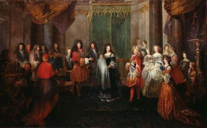 | Keywords: The birth of the Duke of Burgundy at Versailles on 6 August 1682 by Antoine Dieu.jpg artwork Versailles en Birth of the Duke of Burgundy http //www culture gouv fr/Wave/image/joconde/0020/m502004_77ee149_p jpg creator Antoine Dieu 1682 Antoine Dieu Louis Duke of Burgundy Louis XIV of France in paintings Marie Thérèse of Austria Louis Grand Dauphin Cardinal de Bouillon Chambre de la Dauphine du Château de Versailles 1682 paintings Paintings in the Musée national du Château de Versailles 1680s paintings from France Philippe Duke of Orléans Regent of France Royal families in art PD-old-100 ImageNote 1 98 140 26 105 499 302 2 Cardinal de Bouillon ImageNoteEnd 1 ImageNote 2 174 130 23 85 499 302 2 Louis XIV ImageNoteEnd 2 ImageNote 3 312 132 14 77 499 302 2 Louis Grand Dauphin ImageNoteEnd 3 ImageNote 4 216 105 15 35 499 302 2 Philippe Duke of Orléans brother of the king ImageNoteEnd 4 ImageNote 5 159 115 11 12 499 302 2 Philippe d'Orléans future Regent of France ImageNoteEnd 5 ImageNote 6 251 111 16 94 499 302 2 Queen Marie Thérèse holding the Duke of Burgundy ImageNoteEnd 6 ImageNote 7 342 210 53 49 749 465 2 The Duke of Burgundy ImageNoteEnd 7 ImageNote 8 276 160 31 133 749 465 2 Louis XIV ImageNoteEnd 8 ImageNote 9 331 158 25 40 749 465 2 Philippe Duke of Orléans ImageNoteEnd 9 ImageNote 10 191 156 29 26 749 465 2 Louis Grand Condé ImageNoteEnd 10 ImageNote 11 244 182 15 71 749 465 2 Philippe Duke of Chartres future Duke of Orléans and Regent of France ImageNoteEnd 11 ImageNote 12 474 215 29 130 749 465 2 Louis Grand Dauphin ImageNoteEnd 12 ImageNote 13 548 177 22 62 749 465 2 Queen Marie Thérèse ImageNoteEnd 13 ImageNote 14 154 220 54 147 749 465 2 Cardinal de Bouillon ImageNoteEnd 14 ImageNote 15 580 204 60 177 749 465 2 Liselotte Duchess of Orléans ImageNoteEnd 15 ImageNote 16 658 198 36 66 749 465 2 Élisabeth Charlotte d'Orléans ImageNoteEnd 16 |