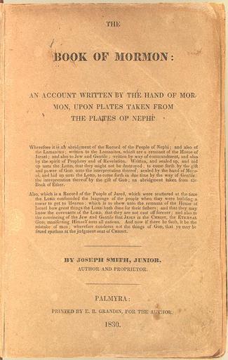 Keywords: The Book of Mormon- An Account Written by the Hand of Mormon upon Plates Taken from the Plates of Nephi.jpg en Title page of a 1830 copy of The Book of Mormon An Account Written by the Hand of Mormon upon Plates Taken from the Plates of Nephi Joseph Smith Jr Image from http //www loc gov/exhibits/religion/vc006661 jpg The Library of Congress Joseph Smith Jr 1830 Joseph Smith Jr died in 1844 therefore this image is in the public domain The copyright holder Joseph Smith Jr died more than 150 years ago Photographs of copyrighted documents are not themselves copyrightable unless they add some derivative value and can be claimed to be original works of authorship which this image does not See http //www copyright gov/circs/circ1 html Copyright Office Basics The relevant copyright pertains to that of the original document which is expired in the United States Canada the European Union and those countries with a copyright term of life of the author plus 70 years This media file is in the public domain in the United States This applies to U S works where the copyright has expired often because its first publication occurred prior to January 1 1923 See http //www copyright cornell edu/public_domain/ this page for further explanation PD-old-100 PD-US Book of Mormon 1830 text |