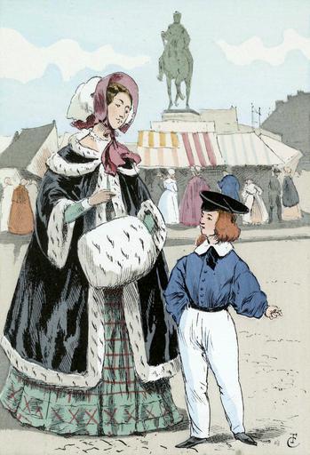 Keywords: The booths on the Pont-Neuf, 1844.jpg This scene depicts a mother and son on the Pont Neuf Paris's oldest bridge where street vendors set up on the sidewalks The child depicted in this plate is wearing long pants and a beret The woman is waering a dress with a wide bell skirt and a fur overcoat with a muff Abstract sources Boucher François 20 000 Years of Fashion New York Harry N Abrams Inc 1967 1898 colored plate 10 x 15 cm Institution Brown University Library object history exhibition history credit line accession number 1-SIZE GT887 U8 1898 1150467546527767 PD-old-100 Images of Paris from the Brown University Library 1844 in Paris Fashion in 1844 Historical images of Pont Neuf Statue of Henri IV in Paris Les modes de Paris 053 Muffs in art Ermine clothing in art Île de la Cité in art Fur fashion in 1865 |