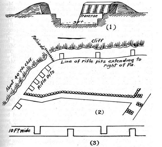 | Keywords: The british sap at te arei.jpg en The British Sap at Te Arei 1 Cross-section of the sap with traverse and gabions 2 Head of the sap close to Maori works Te Arei in March 1861 3 Remains of the sap near north face of Te Arei pa as existing at the present time The New Zealand Wars James Cowan 1922 Pukerangiora Taranaki New Zealand History of New Zealand James Cowan New Zealand writer PD-old | ||||