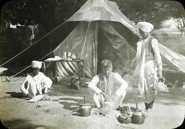 | Keywords: The camp kitchen, India, ca. 1906 (IMP-CSCNWW33-OS14-9).jpg en <br> The camp kitchen India ca 1906 Black and white lantern slide showing three Muslim male staff of the Regions Beyond Missionary Union mission cooking food outside a tent One adolescent boy brings a kettle to an open cooking fire next to which sits another young man who stirs food in a pot Another young man sits on the ground and seems to be cleaning or sharpening knives This slide comes from a collection created by missionaries from Regions Beyond Missionary Union an interdenominational Protestant evangelical mission working in northeast India Bihar and Orissa and Nepal Photographer Unknown Filename IMP-CSCNWW33-OS14-9 tif Coverage date 1900/1910 Subject unesco Domestic workers Part of collection International Mission Photography Archive ca 1860-ca 1960 Part of subcollection Photographs from the Centre for the Study of World Christianity University of Edinburgh U K ca 1900-ca 1940s Repository name Centre for the Study of World Christianity Archival file Volume3/IMP-CSCNWW33-OS14-9 tif Repository address The University of Edinburgh School of Divinity New College Mound Place Edinburgh EH1 2LX United Kingdom Geographic subject country India Format aacr2 lantern slides 8 2 x 8 2cm Geographic subject continent Asia Rights Contact the repository for details Part of series Regions Beyond Missionary Union India captioned lantern slides CSCNWW33/OS14 Repository email divinity-CSWC ed ac uk Date created 1900/1910 Publisher of the digital version University of Southern California Libraries Subject aat genre group portraits Format aat lantern slides; photographs Geographic subject state Bihar Access conditions http //www ed ac uk/schools-departments/divinity/research/centres/world-christianity/collections-resources Geographic subject forests File CSCNWW33/OS14/9 Contributor Gardner Co Opticians Glasgow Subject lcsh Household employees; Cooking; Tents; Camping 1900/1910 date created author http //digitallibrary usc edu/cdm/ref/collection/p15799coll123/id/78232 PD-old-70-1923 Magic lantern images Images from USC Digital Library uploaded by Fæ International Mission Photography Archive ca 1860-ca 1960 |