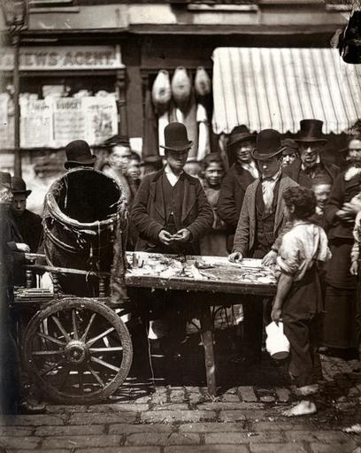 Keywords: street_life_in_london streetlifeinlondon fishmonger st giles stgiles costermonger seven dials sevendials joseph carney josephcarney street market streetmarket london herrings monochrome From 'Street Life in London', 1877, by John Thomson and Adolphe Smith: "Awaiting the moment when the costermonger is able to procure a barrow of his own he must pay eighteen pence per week for the cost of hiring. Then he must beware of the police, who have a knack of confiscating these barrows, on the pretext that they obstruct the thoroughfare and of placing them in what is termed the Green Yard, where no less than a shilling per day is charged for the room the barrow is supposed to occupy. At the same time, its owner will probably be fined from half a crown to ten shillings so that altogether it is much safer to secure a good place in a crowded street market. In this respect, Joseph Carney, the costermonger, whose portrait is before the reader, has been most fortunate. He stands regularly in the street market that stretches between Seven Dials and what is called Five Dials, making his pitch by a well-known newsagent's, whose shop serves as a landmark. Like the majority of his class, he does not always sell fish, but only when the wind is propitious and it can be bought cheaply. On the day when the photograph was taken, he had succeeded in buying a barrel of five hundred fresh herrings for twenty five shillings. Out of these he selected about two hundred of the largest fish, which he sold at a penny each, while he disposed of the smaller herrings at a halfpenny. "Trade was brisk at that moment, though the fish is sometimes much cheaper. Indeed, I have seen fresh herrings sold at five a penny; and this is all the more fortunate, as notwithstanding the small cost, they are, with the exception of good salmon, about the most nutritious fish in the market." For the full story, and other photographs and commentaries, follow this link and click through to the PDF file at the bottom of the description archives.lse.ac.uk/Record.aspx?src=CalmView.Catalog&i... From 'Street Life in London', 1877, by John Thomson and Adolphe Smith: "Awaiting the moment when the costermonger is able to procure a barrow of his own he must pay eighteen pence per week for the cost of hiring. Then he must beware of the police, who have a knack of confiscating these barrows, on the pretext that they obstruct the thoroughfare and of placing them in what is termed the Green Yard, where no less than a shilling per day is charged for the room the barrow is supposed to occupy. At the same time, its owner will probably be fined from half a crown to ten shillings so that altogether it is much safer to secure a good place in a crowded street market. In this respect, Joseph Carney, the costermonger, whose portrait is before the reader, has been most fortunate. He stands regularly in the street market that stretches between Seven Dials and what is called Five Dials, making his pitch by a well-known newsagent's, whose shop serves as a landmark. Like the majority of his class, he does not always sell fish, but only when the wind is propitious and it can be bought cheaply. On the day when the photograph was taken, he had succeeded in buying a barrel of five hundred fresh herrings for twenty five shillings. Out of these he selected about two hundred of the largest fish, which he sold at a penny each, while he disposed of the smaller herrings at a halfpenny. "Trade was brisk at that moment, though the fish is sometimes much cheaper. Indeed, I have seen fresh herrings sold at five a penny; and this is all the more fortunate, as notwithstanding the small cost, they are, with the exception of good salmon, about the most nutritious fish in the market." For the full story, and other photographs and commentaries, follow this link and click through to the PDF file at the bottom of the description archives.lse.ac.uk/Record.aspx?src=CalmView.Catalog&i...