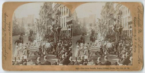 | Keywords: philadelphia stereographs peace jubilee peacejubilee civice parade civiceparade spanish-american war spanishamericanwar parades floats horses Shows the Civic Parade of the Philadelphia Peace Jubilee in 1898. Flags and bunting hang from buildings lining the street. A crowd contained by officers watches as an elaborate float led by horses travels through the street. The jubilee celebrated the end of the Spanish-American War. Accession number: P.2011.47.1537 Shows the Civic Parade of the Philadelphia Peace Jubilee in 1898. Flags and bunting hang from buildings lining the street. A crowd contained by officers watches as an elaborate float led by horses travels through the street. The jubilee celebrated the end of the Spanish-American War. Accession number: P.2011.47.1537 |