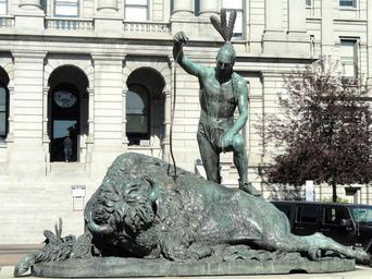 | Keywords: The Closing Era by Preston Powers - DSC01256.JPG The Closing Era by Preston Powers 1842 - 1904 outside the Colorado State Capitol in Denver Colorado USA Created in 1893 for the Chicago World's Fair This statue is now in the public domain I took this photograph 2011-07-29 11 18 39 Daderot Public domain The Closing Era by Preston Powers |