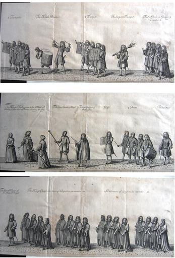 | Keywords: The Coronation Procession of King James II and Queen Mary of Modena (c. 1685, full version).jpg William Sherwin Joseph Collins and others A digital reproduction of the first three out of 19 sheets of a copper engraving of the coronation procession of w James II of England and Queen Mary of Modena The coronation took place at Westminster Abbey on 1685 04 23 The first sheet appears to be in the centre the second sheet at the top and the third sheet at the bottom ca 1685 copper engraving laid on to old album paper Each sheet mm 225 495 accession number object history Created by William Sherwin Joseph Collins and others in London credit line Centre sheet The Kings Herbwoman her 6 Maids w<sup>h</sup> Baskets of Sweet Herbs strewing the way / The Deans Beadle of Westm<sup>r</sup> / The high Constable of Westminster / A Fife musical instrument Fife / + Drums / The drum major Drum Major <br> Top sheet 8 Trumpets / The Kettle Drums / 8 Trumpets / The Sergeant Trumpet / The Six Clerks in Chancery in number 6 <br> Bottom sheet The Closet Keeper of the Chapell Royal / The Kings Chaplains having Dignities in number 14 / Court of Aldermen Aldermen of London in number 25 http //www michaelfinney co uk/catalogue/category/item/index cfm asset_id 1793 other versions The Coronation Procession of King James II and Queen Mary of Modena c 1685 jpg PD-Art-100 1685 engravings Coronations in England Coronations in art James II of England Mary of Modena Kettle drums |