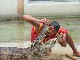 Keywords: the crocodile farm crocodile farm samut prakan thailand show people with crocodiles opened last month teeth jaws trick danger silver entertainment travel