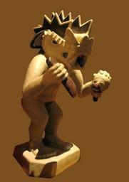 Keywords: The Decapitator.jpg A reproduction of a Moche statue on display at the Army Museum in Stockholm The translation of the caption in the background is as follows THE DECAPITATOR A ferocious mythological being from the Moche culture in Peru c 500 BC In his right hand he is holding a tumi “ a ritual sacrificial knife At the top of Moche society reigned warrior-priests who presided over sacrificial ceremonies where prisoners of war were decapitated and cut up after which their blood was greedily drunk The Moche people possessed no writing system but their artwork is unparalleled in pre-Columbian America In the 8th century AD the culture disappeared without explanation Sculpture after a contemporary clay vessel from Peru 2007-07-04 Peter Isotalo The Decapitator Moche jpg Moche pottery Beheadings in art Collections of the Swedish Army Museum