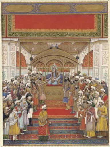 | Keywords: The Delhi Darbar of Akbar II.jpg The Delhi Darbar of Akbar II r 1806-1837 India Mughal Delhi School Painted on ivory depicting Akbar II seated upon a peacock throne within a golden pavilion surrounded by courtiers including his sons the future Bahadur Shah and Mizra Jahangir and attended by the British Resident Sir David Ochterlony in a tricorn hat; with ivory frame carved in deep relief depicting vignettes of Hindu deities including Rama and Sita Vishnu Hanuman Shiva Saraswati Brahma and Parvati with Ganesha interspersed with scrollwork Image 14 5/8 x 10 7/8 in 37 1 x 27 7 cm ; with ivory frame 18¼ x 14½ in 46 4 x 36 8 cm http //www christies com/lotfinder/lot/the-delhi-darbar-of-akbar-ii-india-4346801-details aspx from searchresults pos 9 intObjectID 4346801 sid 73385964-d37d-463e-8a69-8094ff26045a page 1 century 19 author PD-art-100 1820s paintings from India Akbar II Durbar court Peacock Throne |