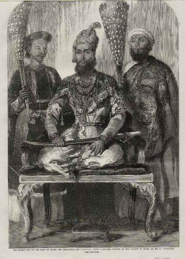 Keywords: The Eldest Son of the King of Delhi.jpg en The Eldest Son of the King of Delhi His Treasurer and Physician-- from a picture painted in the palace at Delhi; by Mr W Carpenter from the Illustrated London News 1857; very large scans of the upper half ; the lower half Source of text http //www harappa com/engr/mughalson html downloaded Dec 1999 Source of image ebay May 2009 From the article accompanying this image emphasis added These fine portraits have been engraved from a picture painted in the Fort or Palace of Delhi by Mr William Carpenter The group consists of the eldest son of the King of Delhi; his Treasurer a Hindoo; and Physician a Mussulman; each carrying a morhrchull a brush made of peacocks tails to drive away the flies--which duty is really performed by servants What part the titular King has actually played in the recent awful tragedy it is impossible as yet to say Secretly no doubt he wished the destruction of the English and some restoration of his family rule But the fear of losing his life and pension and the prestige of English domination made it very doubtful that he was more than a mere passive tool in the hands of the insurgents who had proclaimed not himself but his son as their leader; in fact he sent a message to the Lieutenant-Governor of Agra stating that he was not master of his actions All this will no doubt be fully investigated at the close of the revolt Even should this descendant of Timour and Auranzebe not be guilty it is clear to us that the British as in the case of the King of Oude must take sufficient precautions against any future use of an Imperial authority through this august puppet Every account from India clearly shows that it is the Mussulmans who are at the bottom of the insurrection and that Hindoos are only the instruments The King of Delhi may not have planned or even have fomented the insurrection But a Prince with a historical name in Delhi the focus of the Moslem fanaticism in India without a single European regiment inside is a placing of military and political capital in the hands of our enemies which we are persuaded will not soon happen again http //www harappa com/engr/mughalson html 1857 http //www columbia edu/itc/mealac/pritchett/00routesdata/1800_1899/1857revolt/delhiseized/delhiseized html originally from Illustrated London News 1857 Creator William Carpenter PD-old-100-1923 Uploaded with UploadWizard ILN 1857 1857 in India 1857 engravings Engravings of men of India Mirza Fath-ul-Mulk Men of the Mughal Empire Men of Delhi Portraits in the Illustrated London News William Carpenter painter |