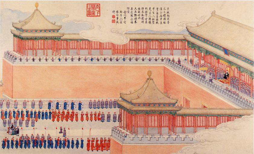 Keywords: The Emperor is presented with prisoners at the Wumen (Middlegate).jpg en The Qianlong Emperor is presented with prisoners of the Jinchuan Campaign 1771-1776 zh-hans 平定两金 之午门受俘图 http //www battle-of-qurman com cn/e/hist htm late XVIII century A collaboration between Chinese and European painters The Jesuit missionaries involved in producing the drawings in China were Giuseppe Castiglione Jean-Denis Attiret Ignace Sichelbart and Jean Damascene The engravings were executed in Paris under the direction of Charles-Nicolas Cochin of the Académie Royal at the Court of Louis XVI and the individual engravers include Le Bas Aliamet Prevot Saint-Aubin Masquelier Choffard and Launay PD-Art Military of Qing China Ten Great Campaigns Paintings of the Qing Dynasty History of the Forbidden City Forbidden City in art Meridian Gate Forbidden City Prisoners in China |