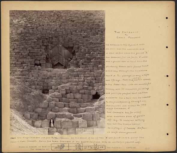 | Keywords: The Entrance to Great Pyramid by Boston Public Library.jpg Scrapbook page containing one annotated photograph of a man standing in front of the entrance to the Cheops Pyramid in Egypt The page includes a sketch of Cheops s name in hieroglyphics which is painted in the interior of the pyramid Subjects Egypt travel photography pyramids tombs Jīzah Ahrāmāt al- Page size 33 x 38 1 cm Annotations The entrance to this pyramid as to all others is on the north side and is about 45 feet above the ground A One descends first as far as D where was a granite door so hard that plundering Arabs were forced to cut a new way through the limestone round it This passage is only a trifle over 3 ft high From this point the visitor ascends to the Great Hall with its wonderful masonry with its marvelous jointing and polish so perfect that neither a needle nor a hair can be inserted between the joints Passing through an Antechamber one comes to the Kings Chamber J This chamber has for a roof nine enormous slabs of granite 18 ½ ft long it contains nothing now but the broken lidless sarcophagus of Cheops Its floor is 140 ft above ground Above the Kings Chamber are five hollow chambers On the stones of one of them O was found in red paint the name of Kufu Cheops - Below the Kings Chamber is the Queens Chamber with its wonderful pointed roof- Name of Cheops in red in the interior of the Pyramid- Lepsius Language English photograph has French title Rights No known restrictions Coverage Egypt Notes Title supplied by cataloger derived from captions or annotated information Letters mentioned in annotation correspond with a diagram on the following page Format Scrapbooks Technique Photographs Albumen prints BPL Department Print Department Photo 1 Photographer G Lékégian Cie Title Entrée de la Pyramide No 14 Caption The Entrance to Great Pyramid Date ca 1865-1895 Flickr data on 2011-08-03 Camera Sinar AG Sinarback 54 FW Sinar m License CC BY 2 0 User Boston Public Library BPL Flickr http //flickr com/photos/24029425 N06/2469130012 The Entrance to Great Pyramid December 21 1892 March 8 1893 Flickr upload date 2008-05-01 17 11 19 William Vaughn Tupper Flickr uploader http //www flickr com/people/24029425 N06 BPL User Flickr upload bot/upload 14 49 3 August 2011 UTC Fæ CC BY 2 0 PD-old-100 Historical images of Great Pyramid 1890s Tupper Scrapbooks volume 26 Lower Egypt G Lekegian Entrance of the Great Pyramid of Giza 1890s Photos uploaded from Flickr by Fæ using a script |